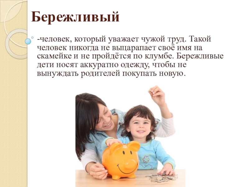 Бережливый-человек, который уважает чужой труд. Такой человек никогда не выцарапает своё имя на скамейке и не пройдётся по клумбе. Бережливые дети носят аккуратно одежду, чтобы не вынуждать родителей покупать новую.