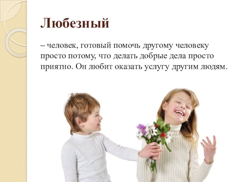 Любезный– человек, готовый помочь другому человеку просто потому, что делать добрые дела просто приятно. Он любит оказать