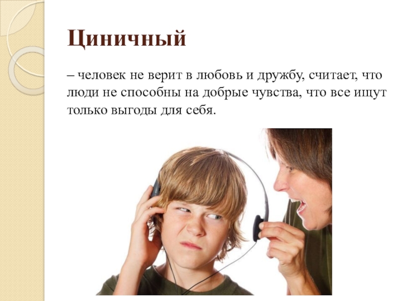 Циничный– человек не верит в любовь и дружбу, считает, что люди не способны на добрые чувства, что