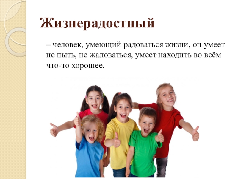 Жизнерадостный– человек, умеющий радоваться жизни, он умеет не ныть, не жаловаться, умеет находить во всём что-то хорошее.