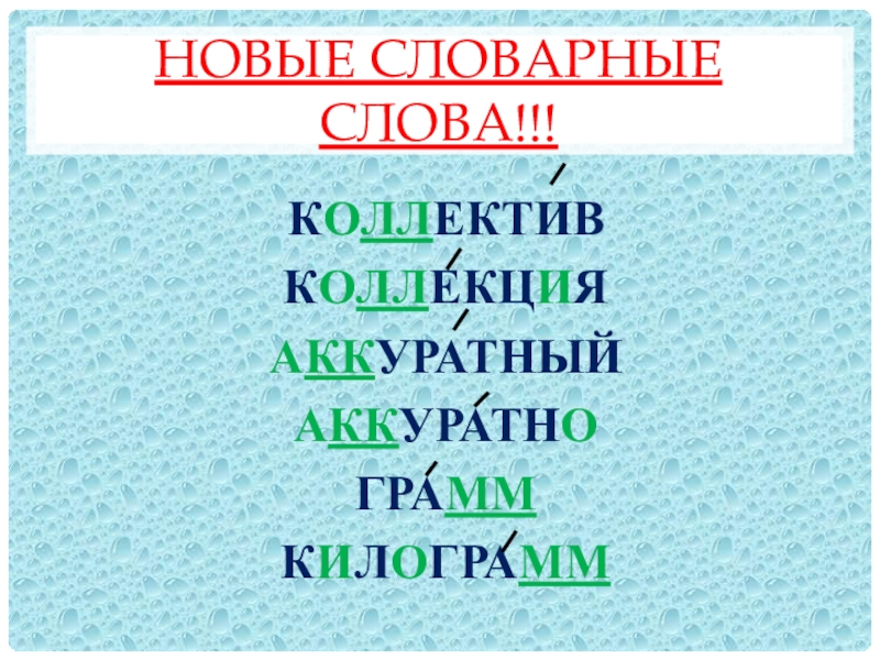Новые словарные слова!!!КОЛЛЕКТИВКОЛЛЕКЦИЯАККУРАТНЫЙАККУРАТНОГРАММКИЛОГРАММ