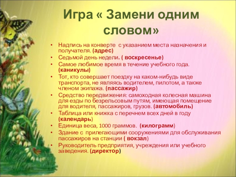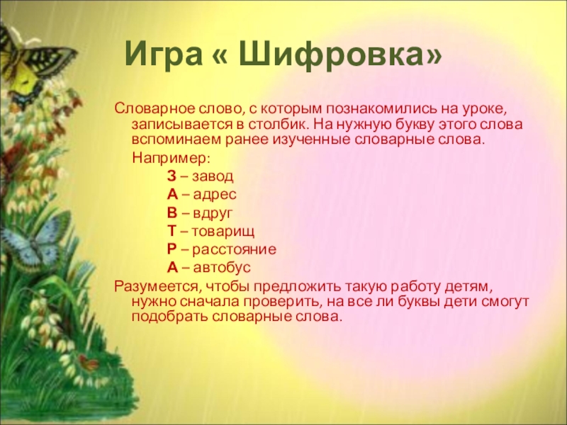 слово должно начинаться с последней буквы предыдущего. Записывают 6 – 8 слов. Предложивший слово комментирует его.