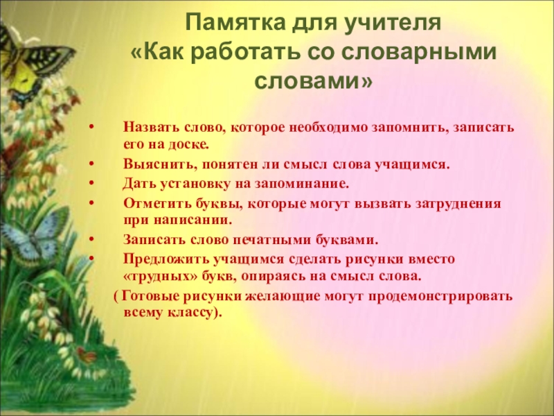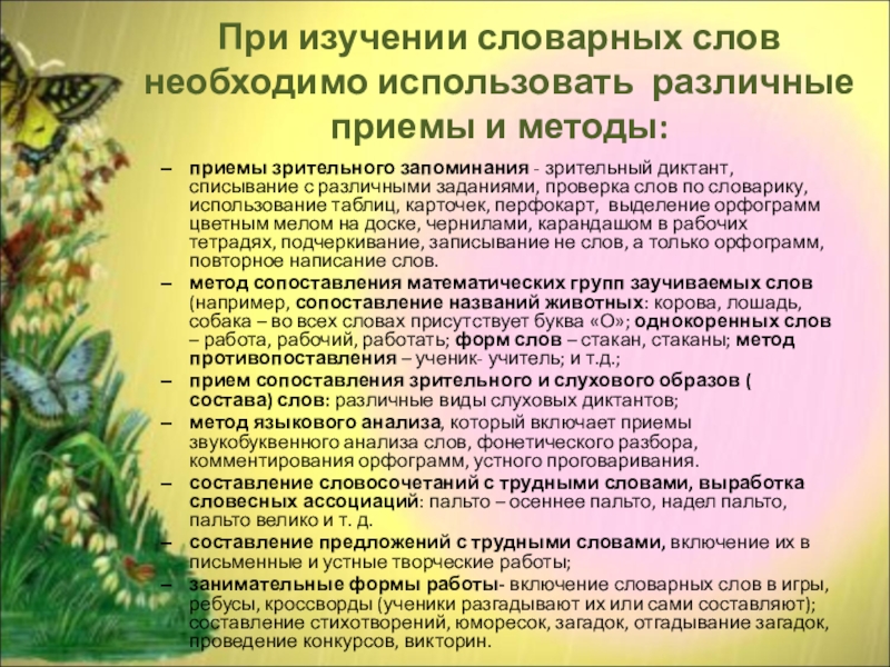 Слайд 7При изучении словарных слов необходимо использовать различные приемы и методы: