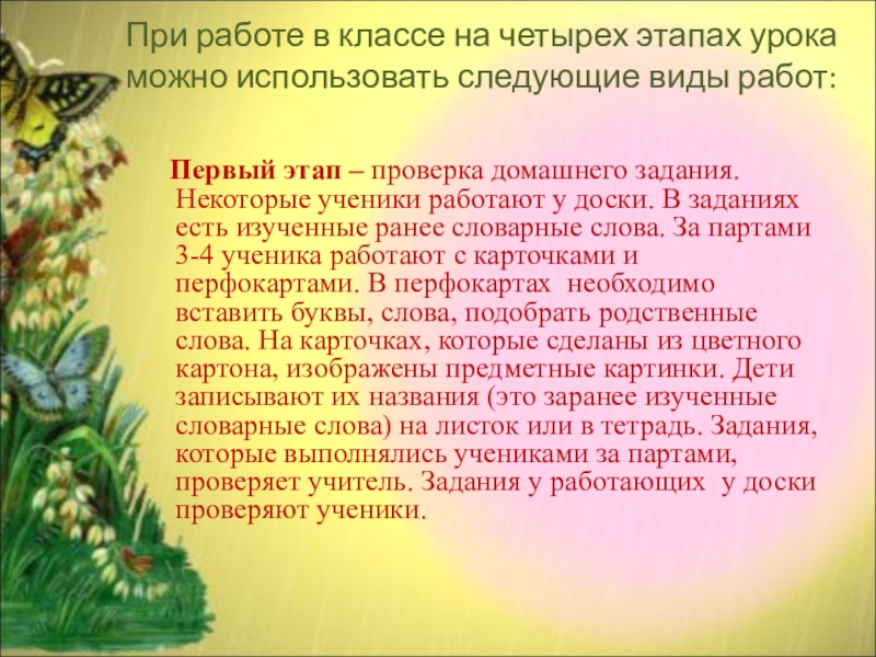 Первый этап – проверка домашнего задания. Некоторые ученики работают у доски. В заданиях есть изученные ранее словарные слова. За партами 3-4 ученика работают с карточками и перфокартами. В перфокартах необходимо вставить буквы, слова, подобрать родственные слова. На карточках, которые сделаны из цветного картона, изображены предметные картинки. Дети записывают их названия (это заранее изученные словарные слова) на листок или в тетрадь. Задания, которые выполнялись учениками за партами, проверяет учитель. Задания у работающих у доски проверяют ученики.
