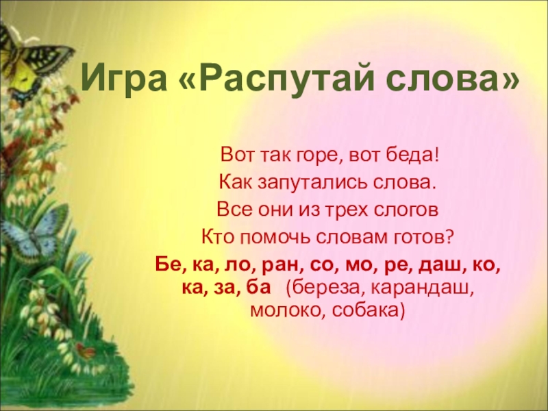 Бе, ка, ло, ран, со, мо, ре, даш, ко, ка, за, ба (береза, карандаш, молоко, собака)