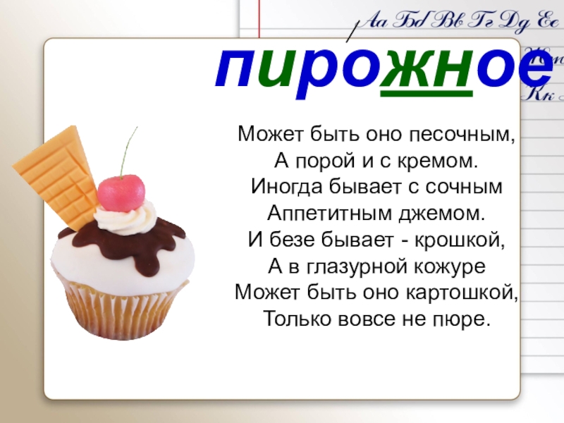 пирожноеМожет быть оно песочным, А порой и с кремом. Иногда бывает с сочным Аппетитным джемом. И