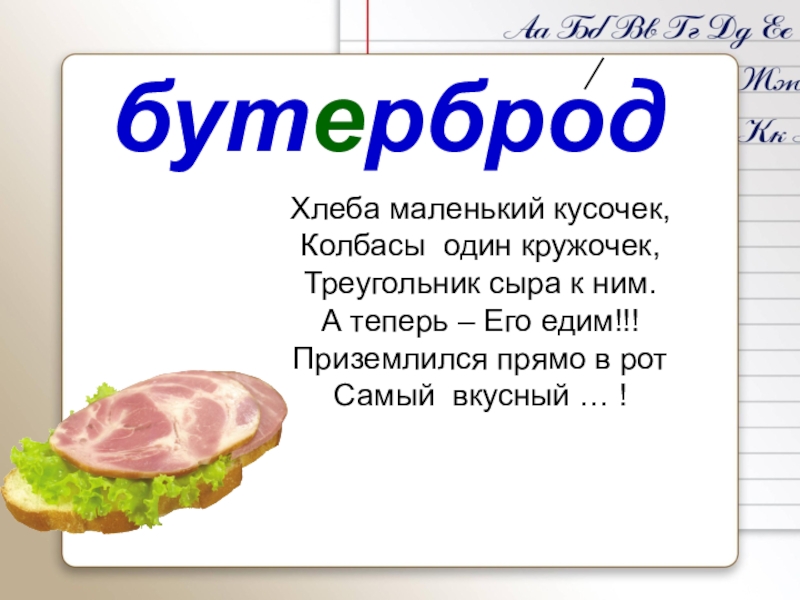 бутербродХлеба маленький кусочек, Колбасы  один кружочек, Треугольник сыра к ним. А теперь – Его едим!!! Приземлился прямо в рот Самый  вкусный … !