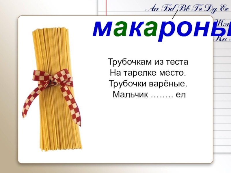 макароныТрубочкам из тестаНа тарелке место.Трубочки варёные. Мальчик …….. ел