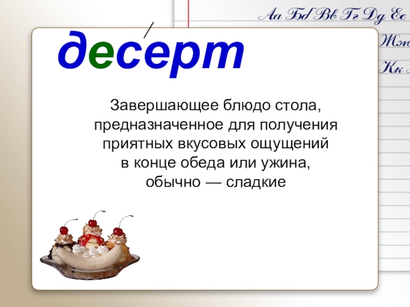 десерт Завершающее блюдо стола, предназначенное для получения приятных вкусовых ощущений в конце обеда или ужина, обычно — сладкие