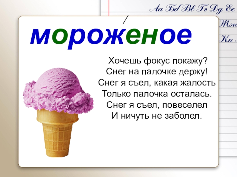 мороженое Хочешь фокус покажу? Снег на палочке держу! Снег я съел, какая жалость Только палочка осталась. Снег