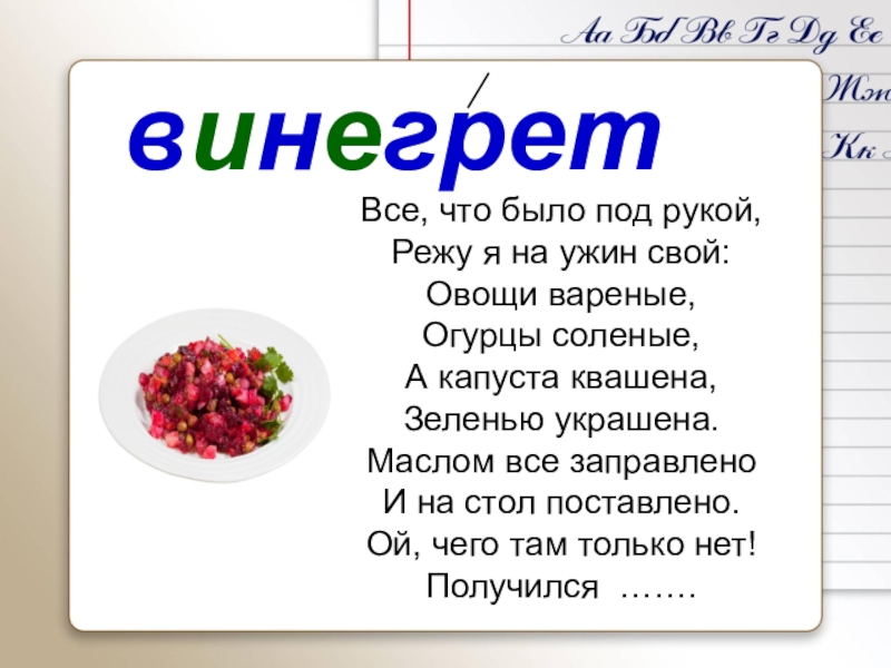 винегретВсе, что было под рукой, Режу я на ужин свой: Овощи вареные, Огурцы соленые, А капуста
