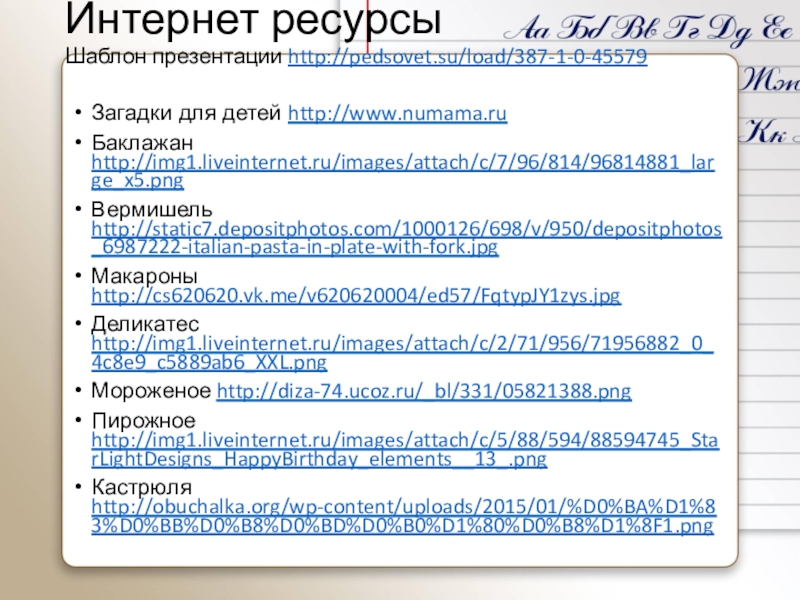 Интернет ресурсы Шаблон презентации http://pedsovet.su/load/387-1-0-45579  Загадки для детей http://www.numama.ru Баклажан http://img1.liveinternet.ru/images/attach/c/7/96/814/96814881_large_x5.png Вермишель http://static7.depositphotos.com/1000126/698/v/950/depositphotos_6987222-italian-pasta-in-plate-with-fork.jpg Макароны http://cs620620.vk.me/v620620004/ed57/FqtypJY1zys.jpg Деликатес