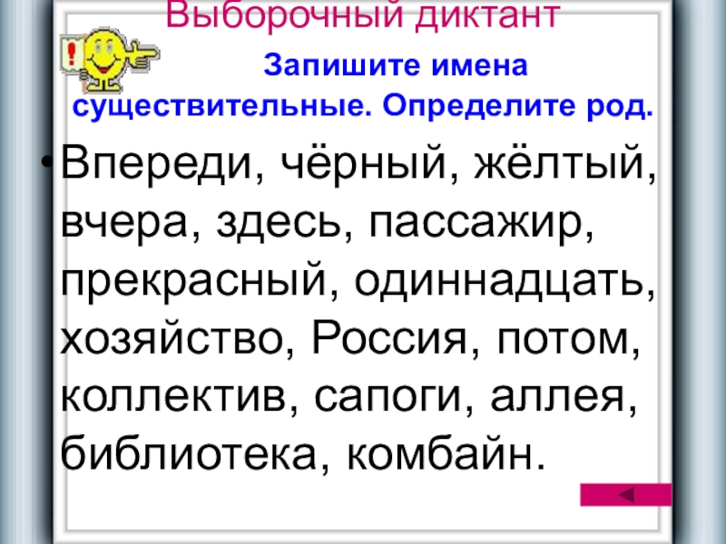 (магазин, направо, орех, хозяйство, одиннадцать, трактор, ракета, аллея, язык).
