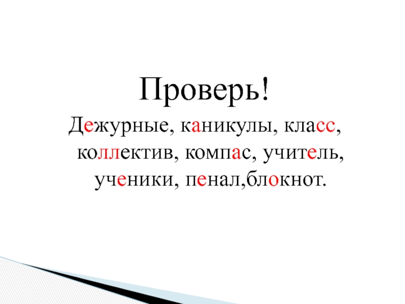 Проверь!Дежурные, каникулы, класс, коллектив, компас, учитель, ученики, пенал,блокнот.