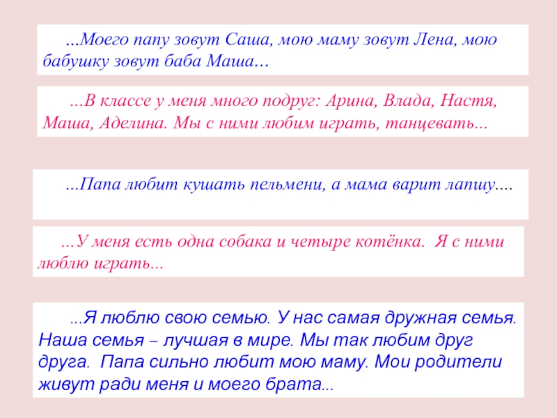 ...Моего папу зовут Саша, мою маму зовут Лена, мою бабушку зовут баба Маша...