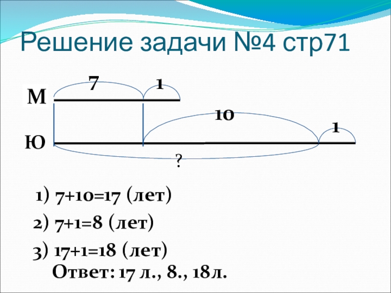 Решение задачи №4 стр717?1) 7+10=17 (лет)2) 7+1=8 (лет)3) 17+1=18 (лет)Ответ: 17 л., 8., 18л.