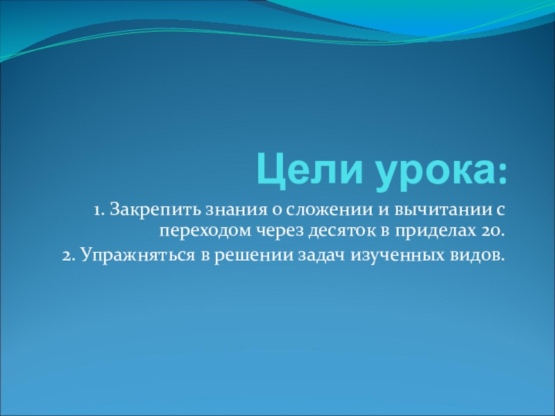 Цели урока: 1. Закрепить знания о сложении и вычитании с переходом через десяток в приделах 20.2. Упражняться в решении задач изученных видов.
