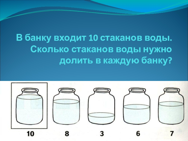 Слайд 5В банку входит 10 стаканов воды. Сколько стаканов воды нужно долить в
