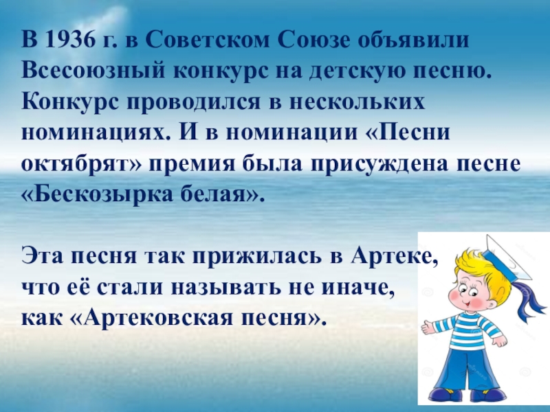 В 1936 г. в Советском Союзе объявили Всесоюзный конкурс на детскую песню. Конкурс проводился в нескольких номинациях. И в номинации «Песни октябрят» премия была присуждена песне «Бескозырка белая». Эта песня так прижилась в Артеке, что её стали называть не иначе, как «Артековская песня».