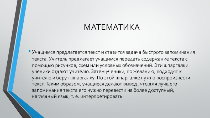 Учащимся предлагается текст и ставится задача быстрого запоминания текста. Учитель предлагает