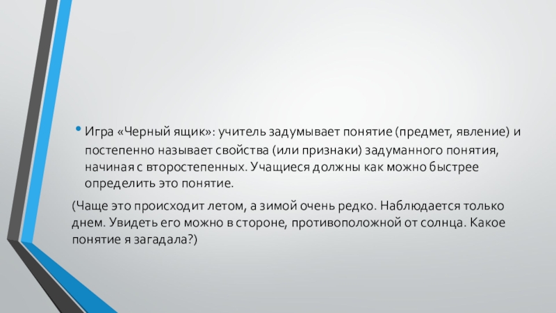 Слайд 13Игра «Черный ящик»: учитель задумывает понятие (предмет, явление) и постепенно называет