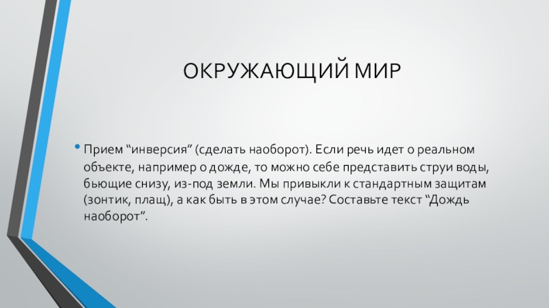 например о дожде, то можно себе представить струи воды, бьющие снизу, из-под земли. Мы привыкли к стандартным защитам (зонтик, плащ), а как быть в этом случае? Составьте текст “Дождь наоборот”.