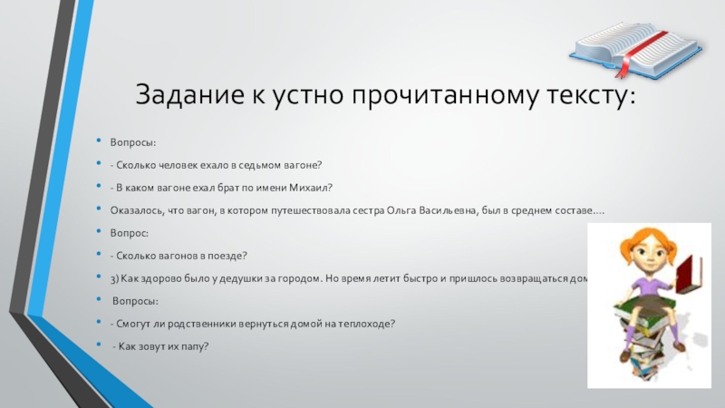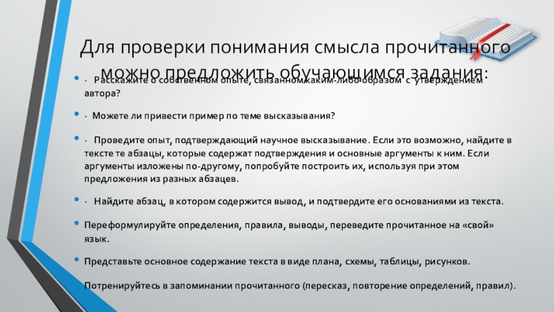 Слайд 8Для проверки понимания смысла прочитанного можно предложить обучающимся задания:
