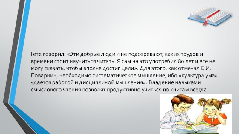 времени стоит научиться читать. Я сам на это употребил 80 лет и все не могу сказать, чтобы вполне достиг цели». Для этого, как отмечал С.И.Поварнин, необходимо систематическое мышление, ибо «культура ума» «дается работой и дисциплиной мышления». Владение навыками смыслового чтения позволят продуктивно учиться по книгам всегда.