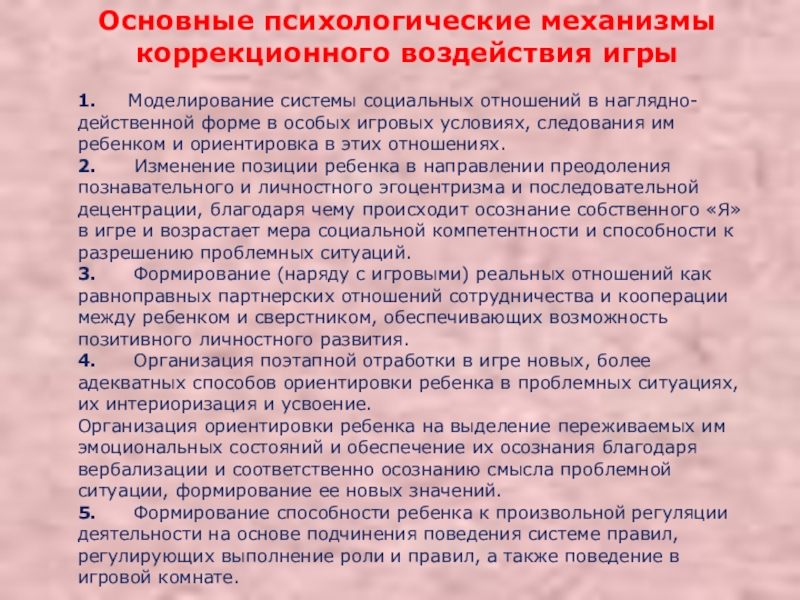 Слайд 16Основные психологические механизмы коррекционного воздействия игры