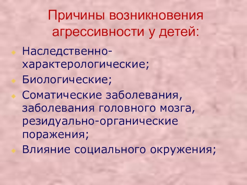 Слайд 9Причины возникновения агрессивности у детей: