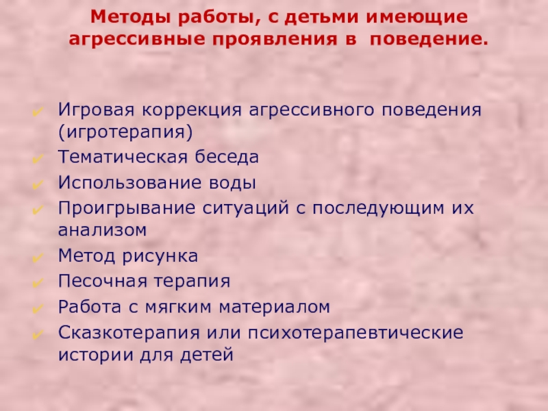 Слайд 13Методы работы, с детьми имеющие агрессивные проявления в поведение.