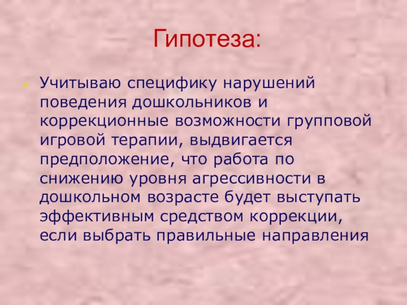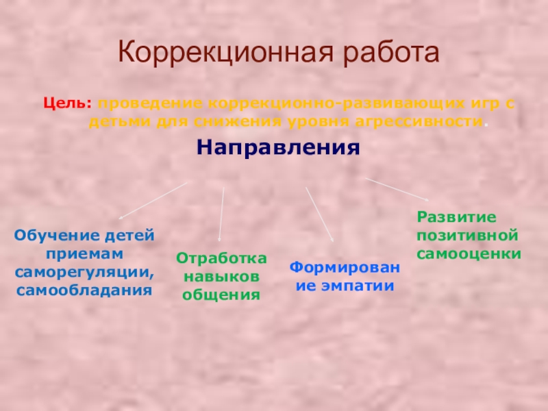 выдвигается предположение, что работа по снижению уровня агрессивности в дошкольном возрасте будет выступать эффективным средством коррекции, если выбрать правильные направления