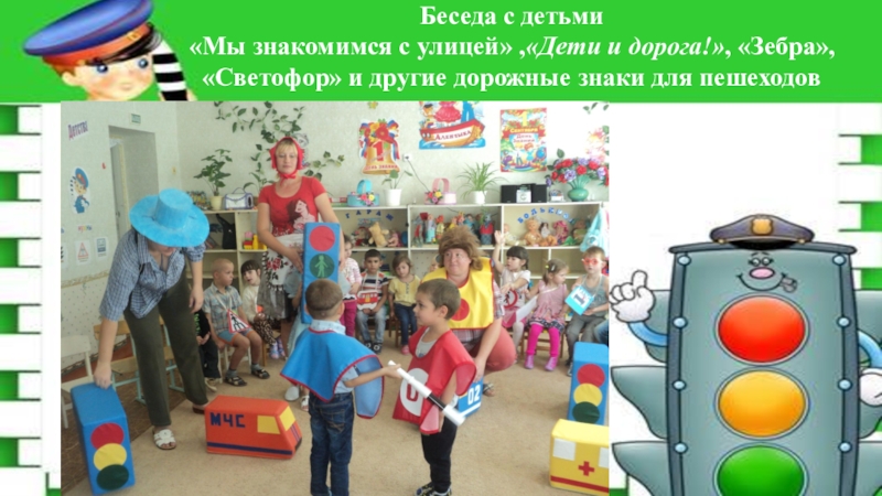 Беседа с детьми«Мы знакомимся с улицей» ,«Дети и дорога!», «Зебра», «Светофор» и другие дорожные знаки для пешеходов