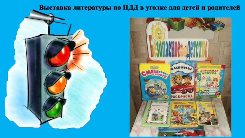 Слайд 10Выставка литературы по ПДД в уголке для детей и родителей