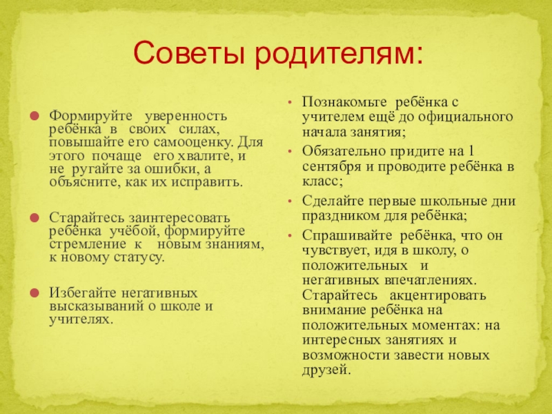 Спрашивайте ребёнка, что он чувствует, идя в школу, о положительных и негативных впечатлениях. Старайтесь акцентировать внимание ребёнка на положительных моментах: на интересных занятиях и возможности завести новых друзей.