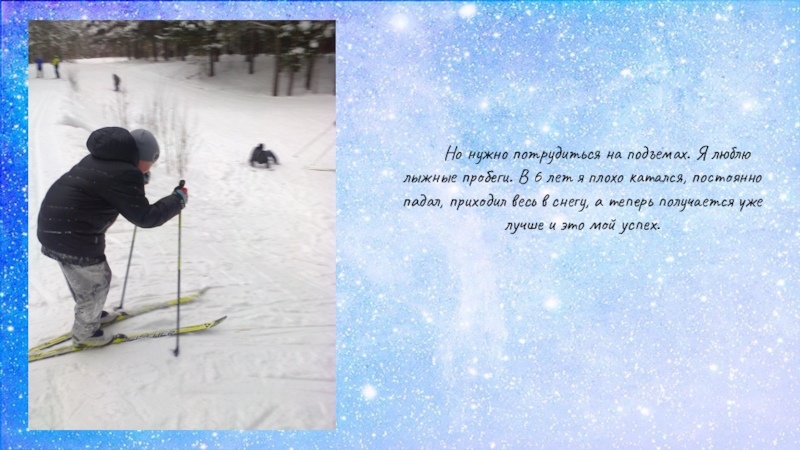 Слайд 8Но нужно потрудиться на подъемах. Я люблю лыжные пробеги. В 6