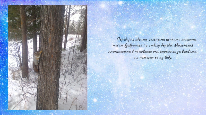 стволе старого дерева, посмотрел туда и увидел белку! Она держалась на стволе, крепко вцепившись в кору коготками на лапках. С первого взгляда было видно, что мех у белочки очень густой с серебристым отливом. Создается впечатление, что пушистый хвост заменяет белке парашют, когда она скачет по деревьям. Белки бегают по деревьям, как будто играют в догонялки, стряхнув с них снежное убранство. Тут же несколько легких хлопьев снега упали вниз с еле слышным шелестом.