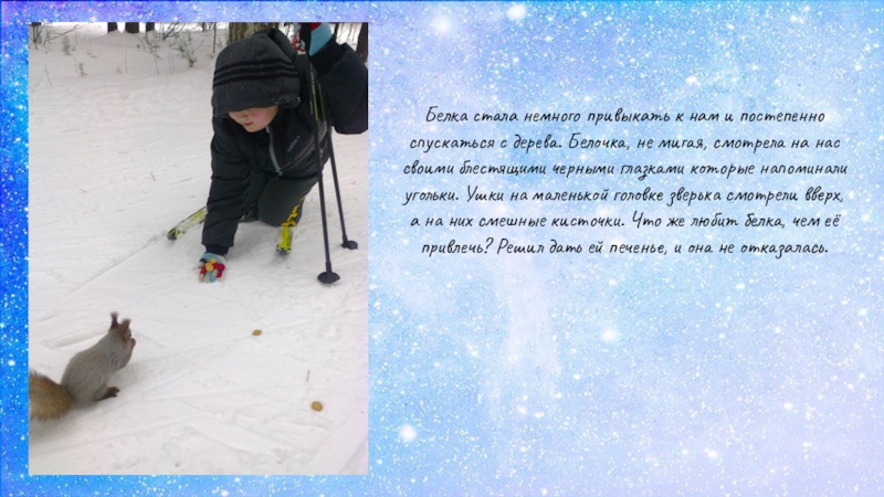 Слайд 11Белка стала немного привыкать к нам и постепенно спускаться с дерева.