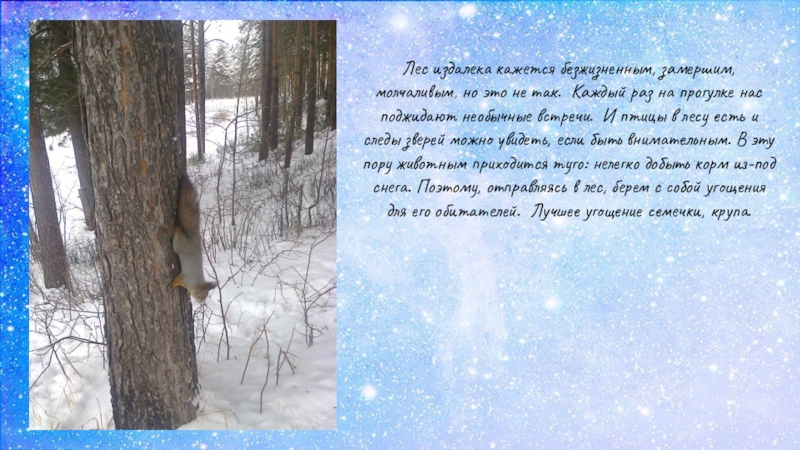 раз на прогулке нас поджидают необычные встречи. И птицы в лесу есть и следы зверей можно увидеть, если быть внимательным. В эту пору животным приходится туго: нелегко добыть корм из-под снега. Поэтому, отправляясь в лес, берем с собой угощения для его обитателей. Лучшее угощение семечки, крупа.