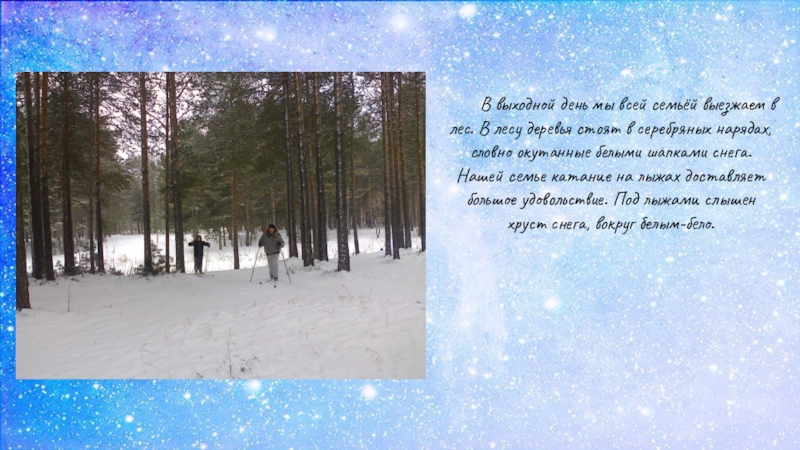 деревья стоят в серебряных нарядах, словно окутанные белыми шапками снега. Нашей семье катание на лыжах доставляет большое удовольствие. Под лыжами слышен хруст снега, вокруг белым-бело.