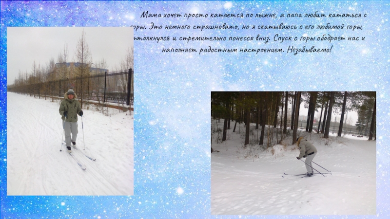 Слайд 7Мама хочет просто катается по лыжне, а папа любит кататься с
