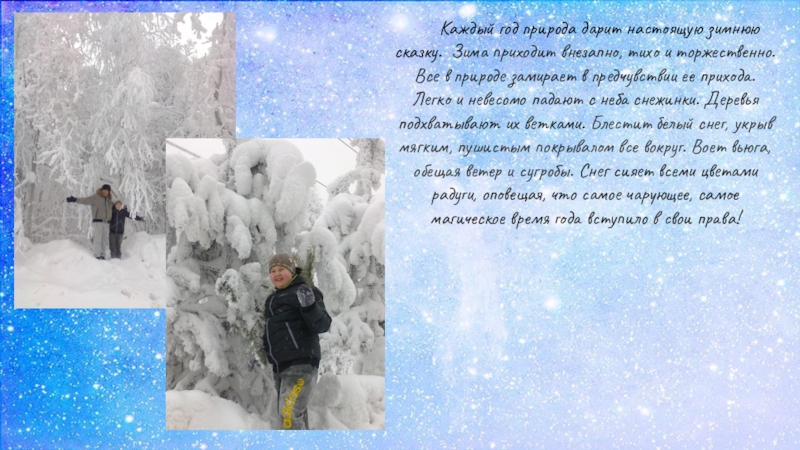 Слайд 2Каждый год природа дарит настоящую зимнюю сказку. Зима приходит внезапно, тихо