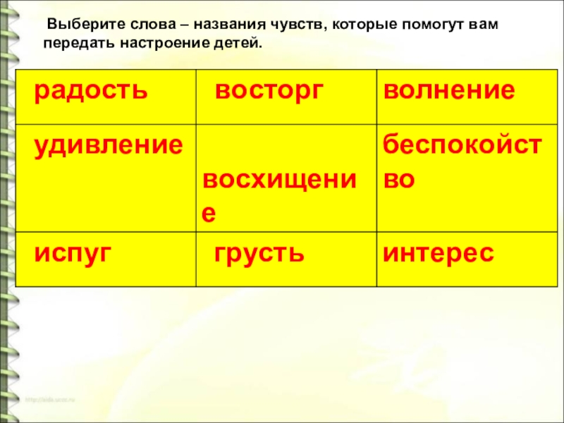 Слайд 18 Выберите слова – названия чувств, которые помогут вам передать настроение детей.