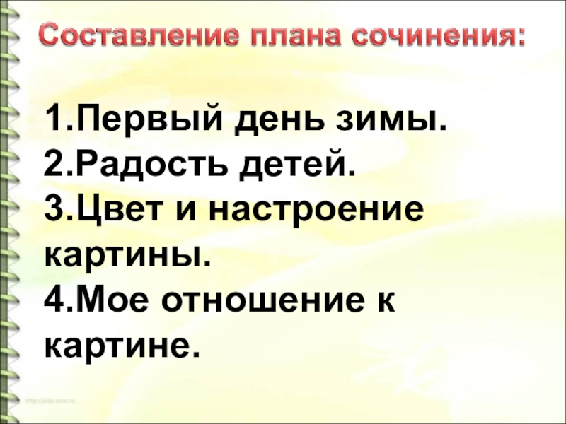 Раннее утро. В комнате необыкновенно светло. Дети проснулись и увидели, что за окном все белым-бело. Оказывается, ночью выпал первый снег. Он покрыл тонким слоем и дома, и заборы, и землю.