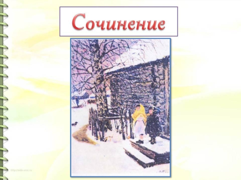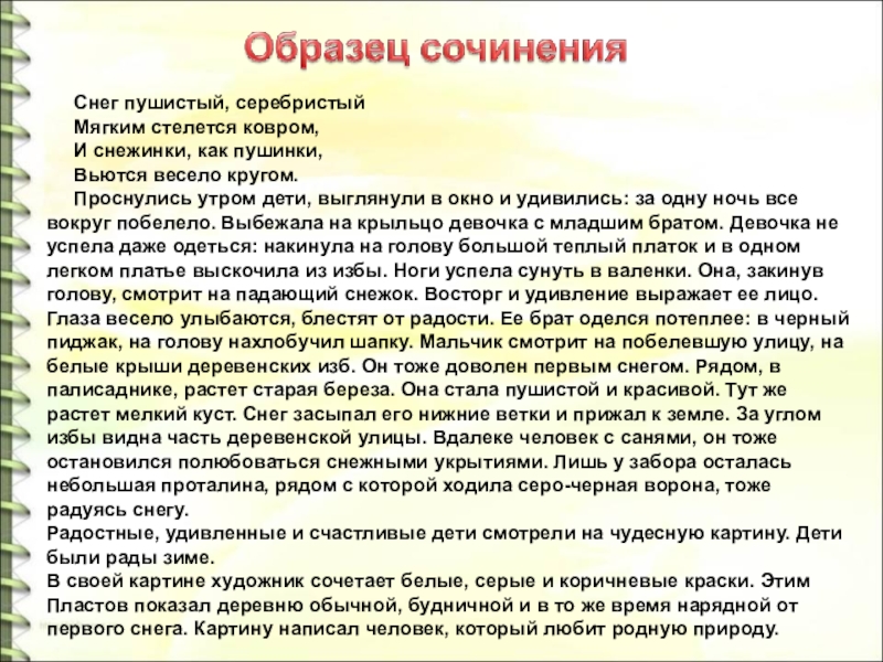 Радостные и счастливые брат и сестра выбежали на крыльцо. Мальчик надел валенки, шапку-ушанку, шубу и собрался погулять. Он давно с нетерпением ожидал прихода зимы. Сестра же выбежала в платье, успела накинуть на голову только платок. На ее лице радостная улыбка. Она подняла голову и долго любовалась пушистым и мохнатым снегом, устилающим землю. Береза, вчера еще голая и прозрачная, сейчас стояла пушистая и красивая. Ворона спокойно и важно шагает по снегу. Она ищет себе корм. Как волшебно изменилась природа от первого снега!