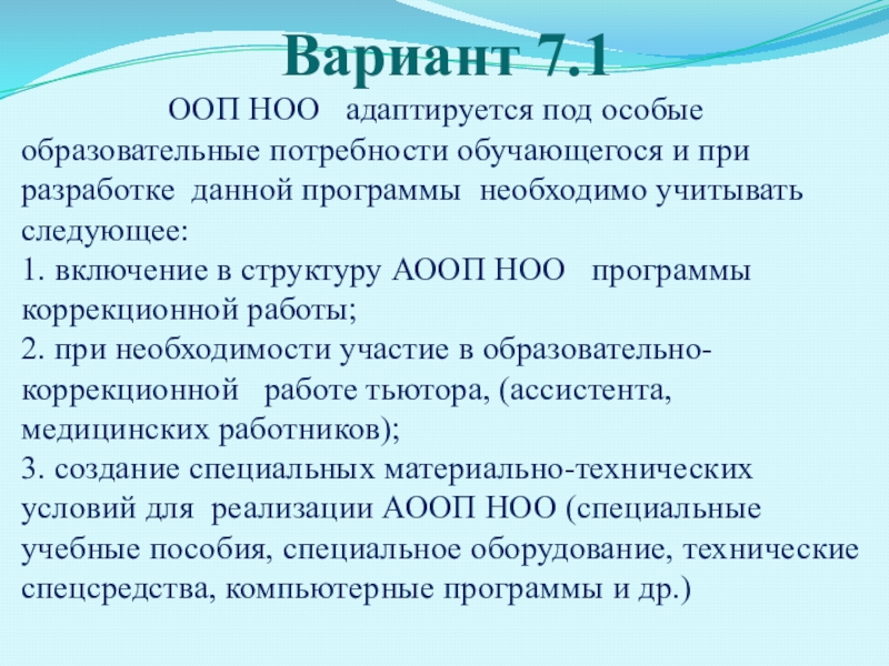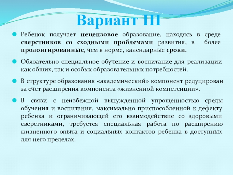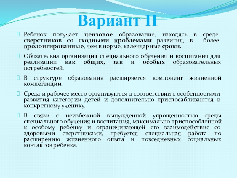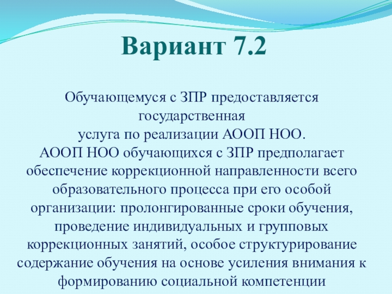 • Данный вариант характеризуется усилением внимания к формированию у обучающихся с ЗПР полноценных социальных (жизненных) компетенций; коррекции недостатков в психическом и (или) физическом развитии, оказанию помощи в освоении содержания образования и формированию готовности к продолжению образования на последующей