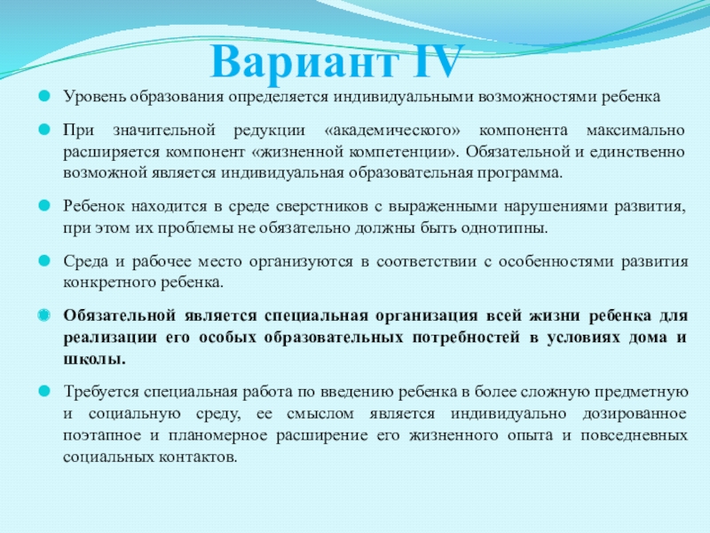 При значительной редукции «академического» компонента максимально расширяется компонент «жизненной компетенции». Обязательной и единственно возможной является индивидуальная образовательная программа.