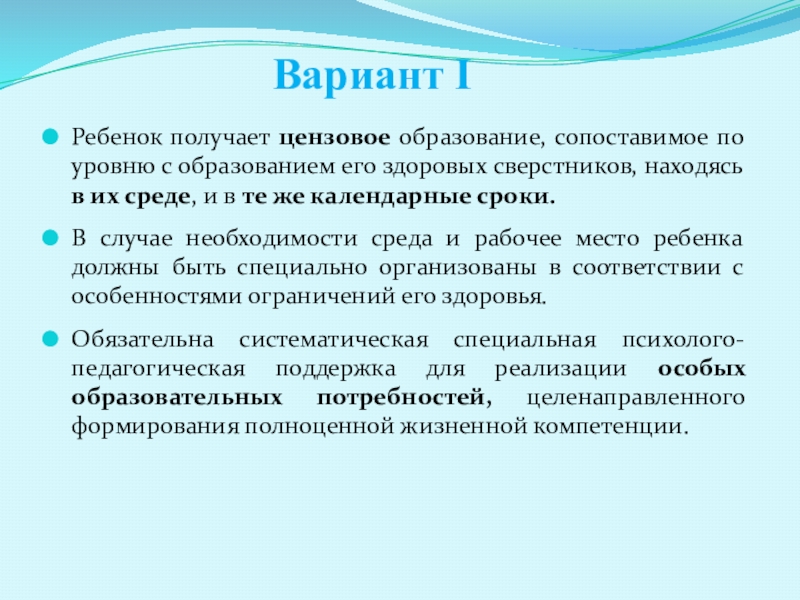 Ребенок получает цензовое образование, сопоставимое по уровню с образованием его здоровых сверстников, находясь в их среде, и в те же календарные сроки.
