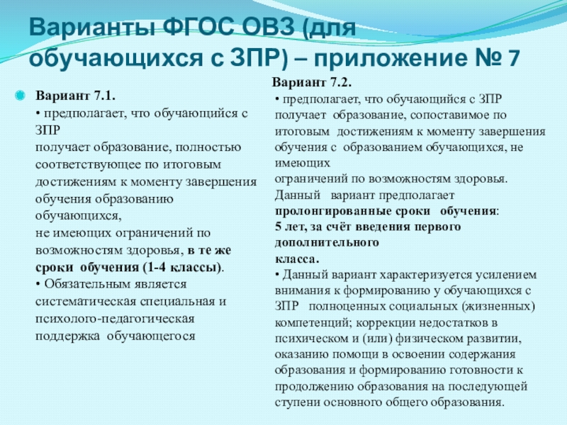 Слайд 19Варианты ФГОС ОВЗ (для обучающихся с ЗПР) – приложение № 7