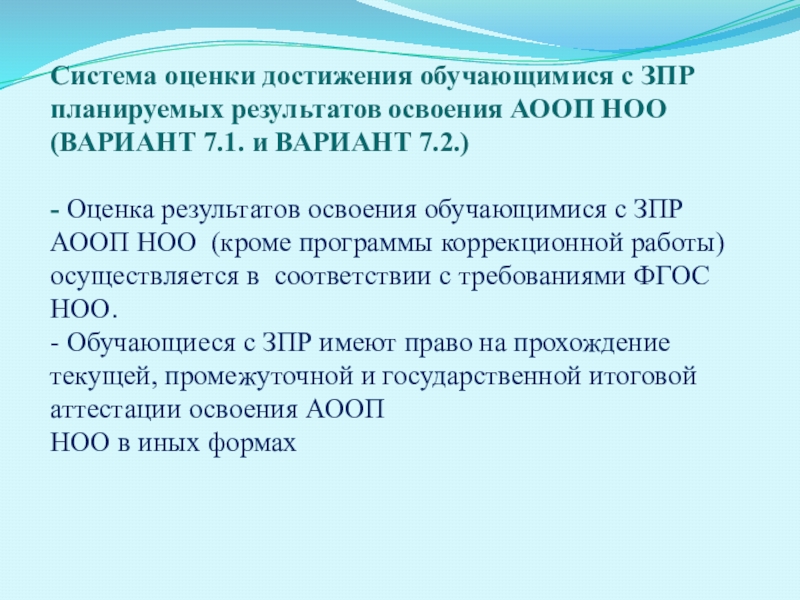- Обучающиеся с ЗПР имеют право на прохождение текущей, промежуточной и государственной итоговой аттестации освоения АООП